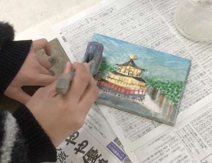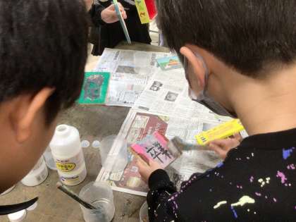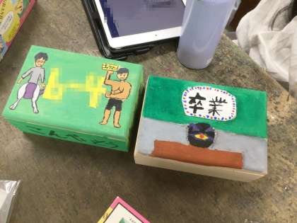 6年生の図工です。グランドボックスにニスを塗って作品の仕上げをしています。小学校の図工で作る最後の大切な思い出となる作品です。