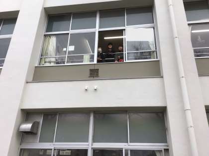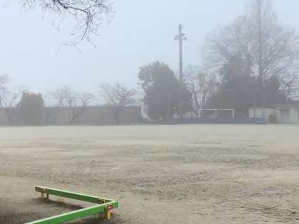 昨日からの雨で、今朝は霧が出ていました。教室から眺めている児童もいました。雲の中もこんな視界でしょうか?