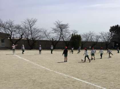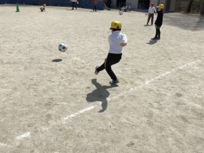 2年生の体育です。サッカーでパスの練習をしています。足の内側を使って蹴るインサイドキックができるようになることを課題として練習をしていました。