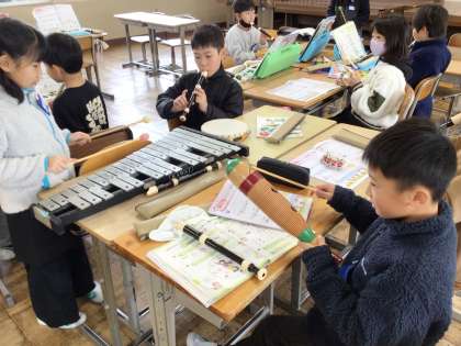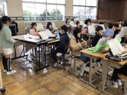 3年生の音楽です。管楽器や打楽器を使って、合奏をしています。いろいろな楽器の音が重なった、すてきな演奏を聞かせてもらいました。