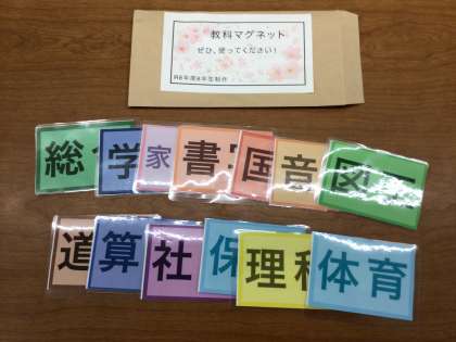 6年生が、卒業プロジェクトで背面黒板の時間割に貼る教科マグネットを作り、各学級に配ってくれました。大切に使わせてもらいます。ありがとうございました。