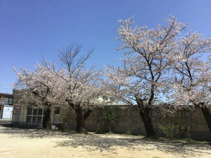 プールの西側に桜の木があります。今日は、見ごろの桜の下で学級写真をとっている学級がありました。