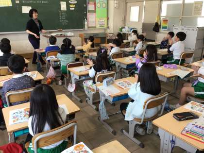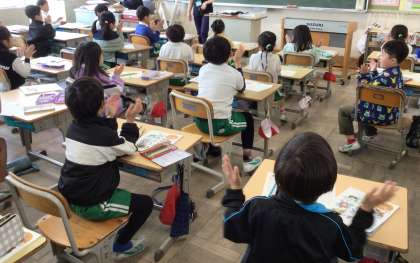 2年生の音楽です。言葉の文字数に合わせて手を打つ、リズム打ちを学んでいます。10文字の言葉では、速いテンポでの手拍子になります。みんなに遅れないように、児童たちは頑張っていました。