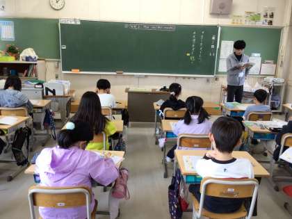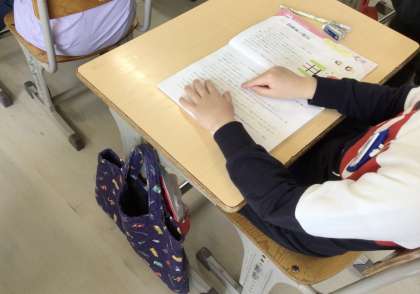 4年生の道徳です。教科書の範読を聞くときに、児童たちはどこを読んでいるかを指でなぞりながら聞く「指読み」をしています。どこを読んでいるかが分かりやすく、理解も深まります。その後、自分の印象にのこった場面に線を引き、学び合う授業が始まりました。