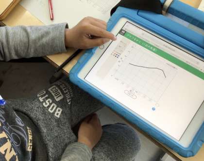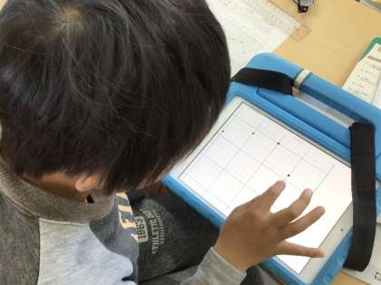 4年生の算数です。折れ線グラフの学習をしています。プリントで折れ線グラフを作成した児童は、その後、教科書の二次元コードを読み取って、学習用タブレットで操作の方法を教え合いながら、折れ線グラフの作成の方法を復習をしていました。