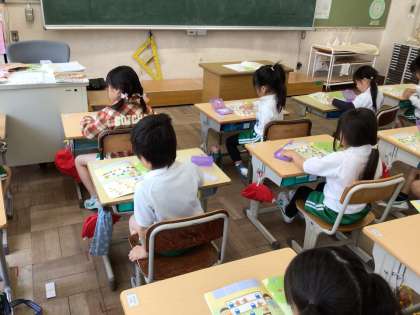 1年生の算数です。数を比較するために数図ブロックを使って考えています。作業することで、数の概念の形成を助けます。
