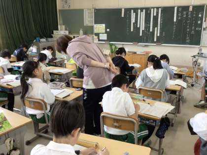 4年生の国語です。物語の登場人物について考え、読解力を育んでいます。授業のふりかえりの場面では担任の先生が児童の様子を見てまわり、質問に答えたり、助言をしたりして個別に学びの支援をしています。