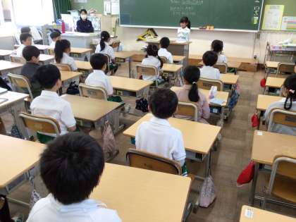 1年生の朝の会が、児童の司会で始まりました。聞く姿勢をよくするための「グー・ピタ・ピン・パー」の合言葉を意識して、しっかりと朝の会に参加できるようにしています。