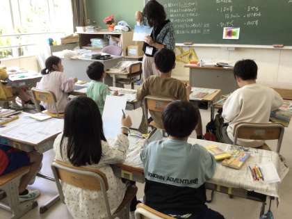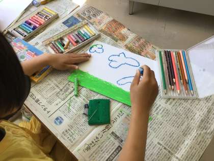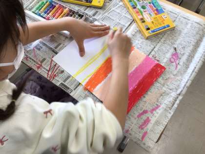 3年生の図工です。「すきなものやたのしみなこと」をテーマに作品を描きます。まぜる、かさねる、ひっかく、のばすなど絵の技法も考えながら作品作りをしました。