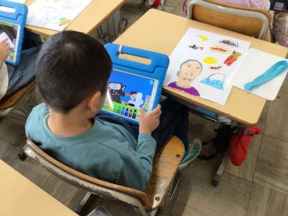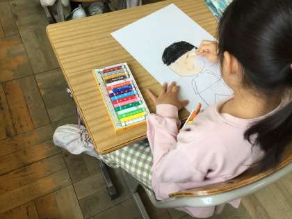 2年生の図工です。自己紹介の絵を描いています。言葉だけでなく、絵があると伝わりやすいです。