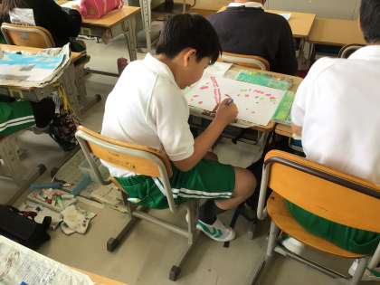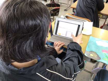 6年生の図工です。花のある風景画を描いています。作品が完成した児童は、学習用タブレットで作品作りの振り返りを記録しています。