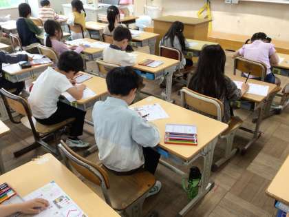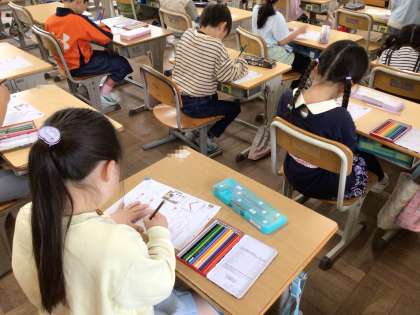 1年生の国語です。ひらがなの練習をしています。今日のひらがなは、「く」でした。「く」のつく言葉も書きました。早く書けた児童は、プリントに描かれた「く」のつくもののイラストに色をぬっています。