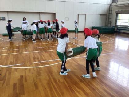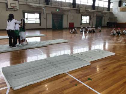 4年生の体育です。マット運動で、倒立の学習をしています。補助をつけながら段階的にできるようにしていきます。授業の終わりには、みんなで協力してマットを片付けました。