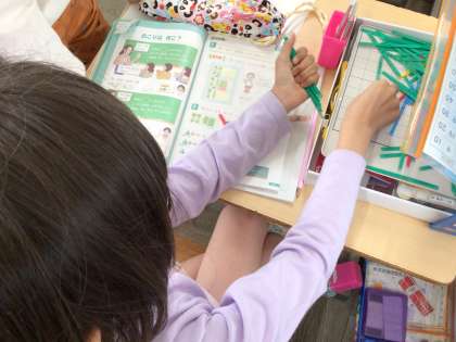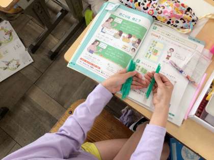2年生の算数です。引き算を使う文章問題を学んでいます。問題文から何算を使うかを考え、図や算数セットの数え棒を使いながら考えました。具体物を使うことで、引き算のイメージをとらえやすくしています。