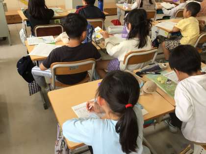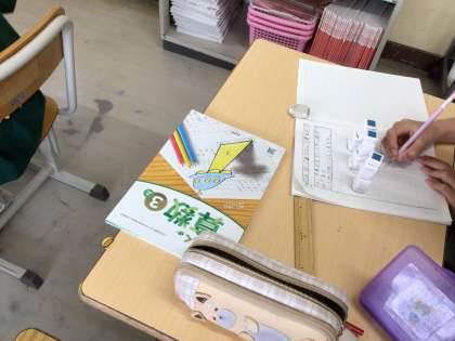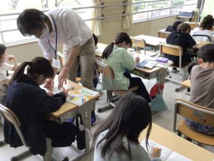 3年生の算数です。割り算を使う文章問題を考えています。数図ブロックを使って、実際に分けて考えている児童もいました。担任の先生は一人一人の様子を見て回り、正解者に〇をつけたり、迷っている児童に助言をしたりして、個別に対応をしています。