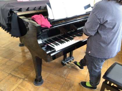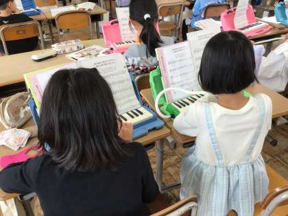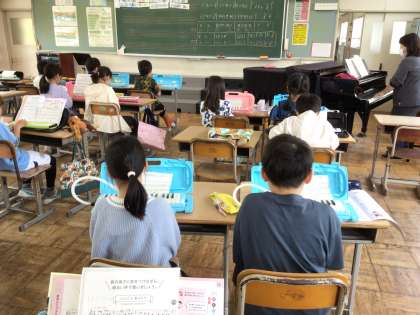 4年生の音楽です。鍵盤ハーモニカで「いいこと ありそう」の曲を演奏しています。児童たちは、音の高さに気をつけながら指を動かしていました。片付けは、先生が演奏している曲が終わるまでに終わるよう、時間を意識できるように工夫していました。(写真下)