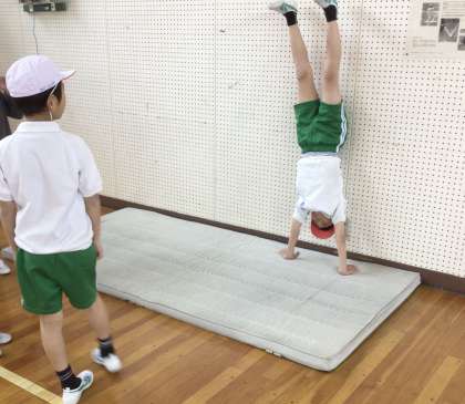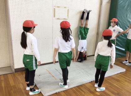 4年生の体育です。壁を使って倒立の練習をしています。壁を使った倒立で、支える腕から足先までの姿勢やバランスのとり方、力の入れ加減を身に付けていきます。
