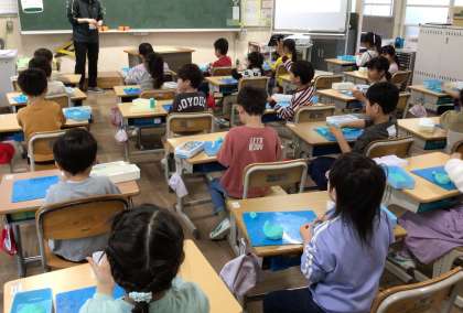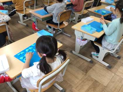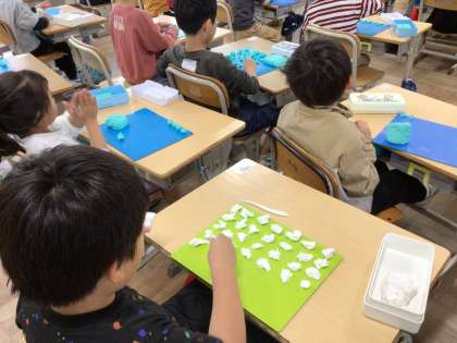 1年生の図工です。粘土で、作品を作る前に「ねんど たいそう」を行っています。ちぎったり、まるめたり、伸ばしたりする基本を練習しています。