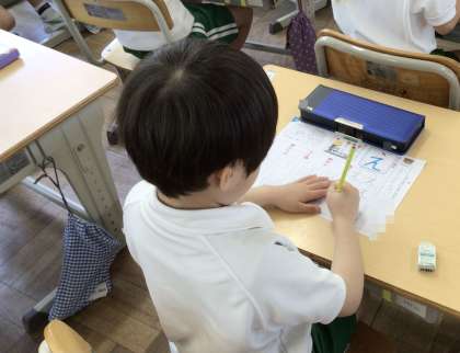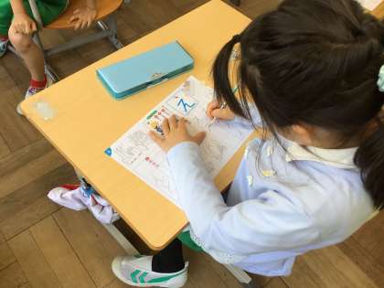 1年生の国語です。今回は「え」を練習しました。おり返して、止める2画目がうまくかけるように、繰り返し練習をしました。
