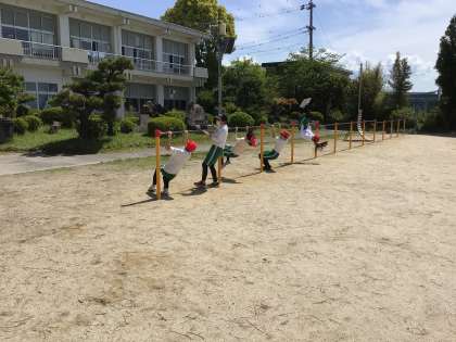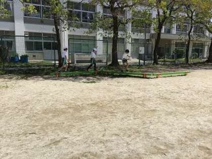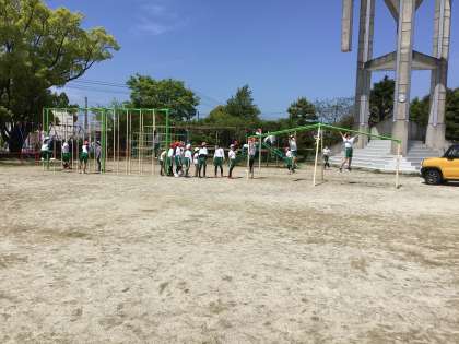 5年生の体育です。準備運動のあと、遊具を使ってサーキットトレーニング(種目を変えながら体を動かすトレーニング)をしています。このトレーニングは、体力づくりの基礎となっています。