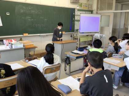 6年生の英語です。自分の好きなものや宝物を英語で紹介しています。紹介のあとは、英語で質疑応答を行い、英語での会話を深めました。