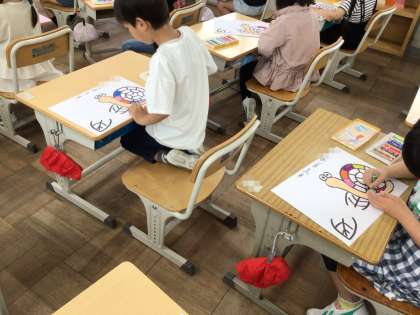 1年生の図工です。クレヨンを使って、カラフルなカタツムリの作品を作っています。色彩豊かなカタツムリができました。
