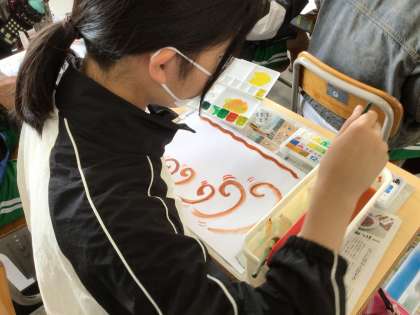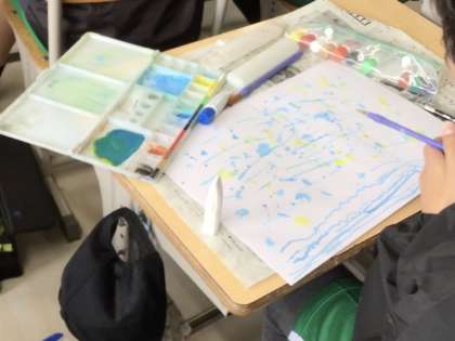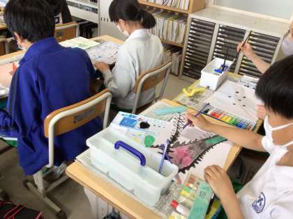 6年生の図工です。目には見えない音には、どんな形や色がぴったりだろうかを考えて表現しています。いろいろな音が聞こえてきそうな作品ができました。