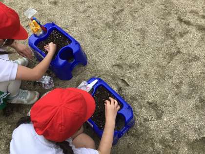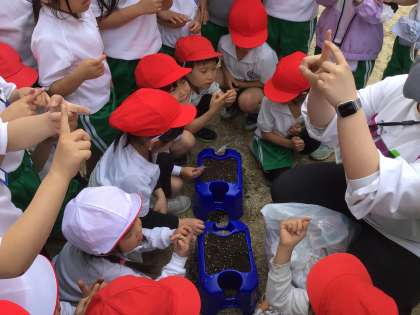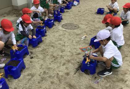 1年生の生活科です。鉢に土を入れ、アサガオの種をまきました。これから、アサガオの世話が始まります。きれいな花が咲くのが楽しみです。