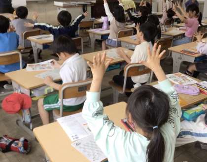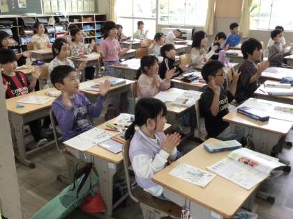 2年生の音楽です。リズムに合わせて、歌いながら手を動かしています。上手にできた児童は、頑張りカードの絵を1つぬっていました。