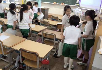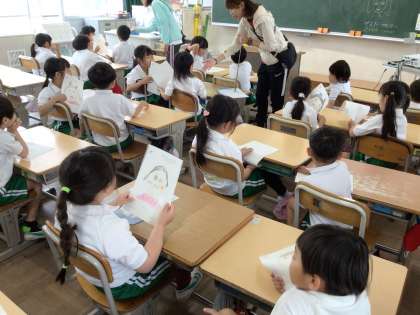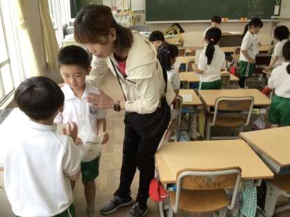 1年生がALTの先生に英語でのあいさつの仕方を教えてもらいました。児童たちは、相手を探して、自分の名前を英語で紹介し合う体験をしました。。