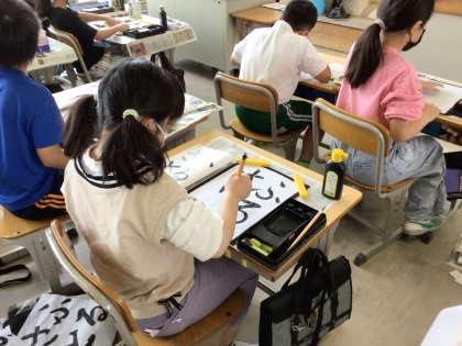 5年生の書写です。課題は「ふるさと」です、曲線が多い文字ですが、お手本を見ながら集中して書いています。