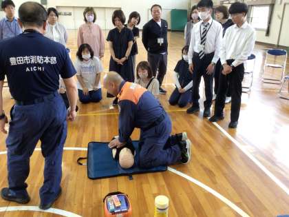 児童が下校した後、消防署の方を講師にお招きして熱中症や水泳学習、食物アレルギーなどで発生するかもしれない緊急時に備えて、研修を教職員で行いました。