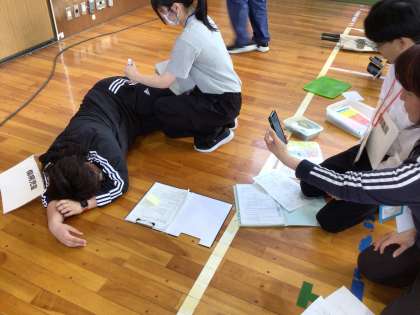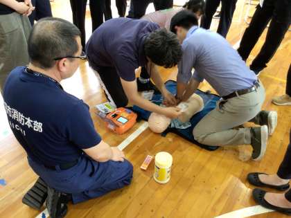 AEDやエピペンの使い方、児童の異変を感じた時の対応から救急車の要請、病院への搬送を想定して、実際にシミュレーションを行いました。