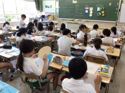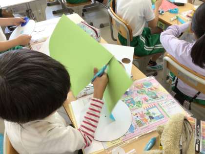 3年生の図工です。割りピンを使って動く作品を作っています。回転板にのせる紙の使い方を考えた下絵をもとに、作品を作っています。