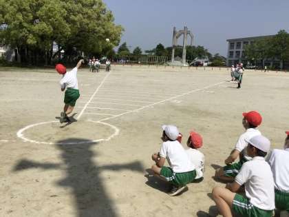 5,6年生の運動場での体力テストの様子です。50m走とボール投げを計測しました。
