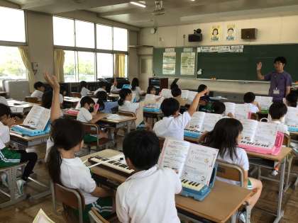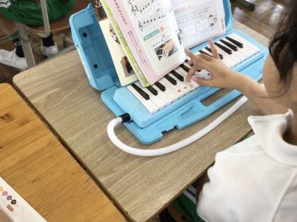 3年生の音楽です。5本の指で、ドレミファソラシドの8音を演奏する方法を学びました。「指くぐり」「指またぎ」という演奏技法を学び、演奏できる曲が増えていきます。