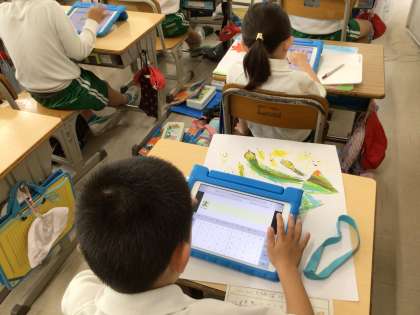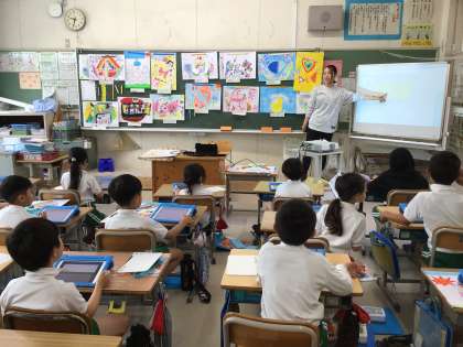 2年生の図工です。「ふしぎなたまご」の作品を見ながら、自分たちの作品の造形的な面白さや楽しさ、表したいこと、表し方などについて、感じ取ったり考えたりしたことを学習用タブレットの発表ノートに記録し、自分の見方や感じ方を広げました。