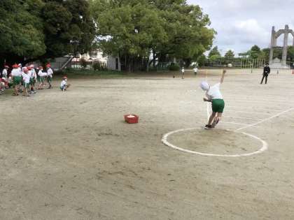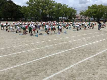 3年生、4年生の体力テストです。準備体操をしっかりと行い、50m走、ボール投げ、長座体前屈、反復横跳び、立ち幅跳びの5種目を計測しました。