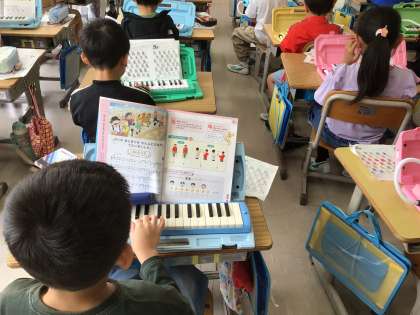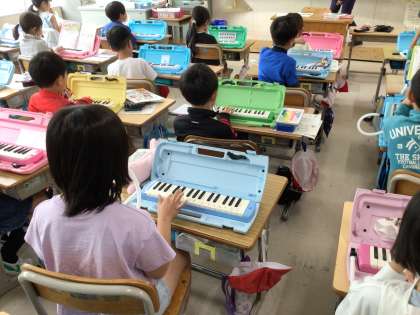 2年生の音楽です。鍵盤ハーモニカの練習しています。「タタ タン」「タン タタタ」といったはくのまとまりで、リズムにのって演奏していました。