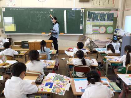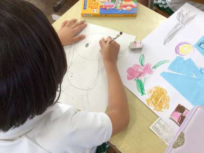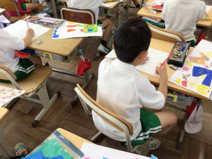 1年生の図工です。作品の中に人を描くための練習をしています。体や手足が一本線にならないように練習しています。