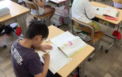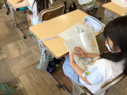2年生の国語です。教科書のお話を場面ごとに分け、出てきた人物やできごとをまとめる学習をしています。読み取って書くことで、読解力が養われます。