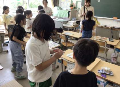 3年生の外国語活動です。数を尋ねる会話を学んでいます。ペアを探して、How many?を使って会話し、相手が英語で答えた数で、ビンゴゲームをしながら、英語の語彙を増やしていきました。