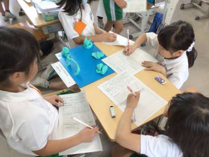 2年生の図工です・「にぎにぎ ねん土」の作品作りを終え、鑑賞の授業です。仲間に作品の見てほしいところを伝えたり、作品のよいところを伝えあったりしました。
