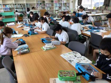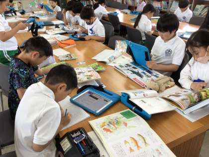 4年生の国語です。「わたしのクラスの『生き物図かん』」の単元で、図書室の本を使って、好きな動物の資料を集めています。どんな図鑑が出来上がるでしょうか。