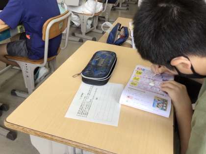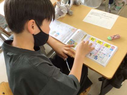 6年生の漢字練習です。「シン・漢字練習」として、音読→指なぞり→書き順指なぞり→空書き→鉛筆なぞり→鉛筆書きと漢字ドリルの活用を工夫して、漢字の読み書きの力を高める学習方法を取り入れていました。