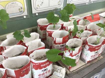 4年生の理科で、ツルレイシを育てて観察します。今は、種から発芽までの様子を観察しています。教室で育てているので、枯れないように水やりをしています。