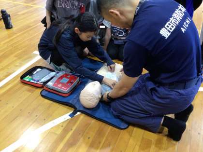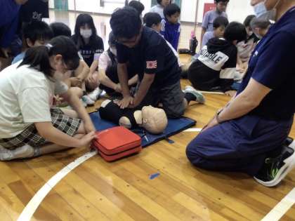 5年生の保健の授業では、「けがの防止と手当て」を学びます。今回は、消防署の方を講師にお招きして、救急救命を学びました。けがの種類や程度を判断して、できるだけ早く手当てをすることが、命を助けることができることを学びました。写真は、胸骨圧迫やAEDの使用方法を学んでいる様子です、消防署の皆様、ありがとうございました。