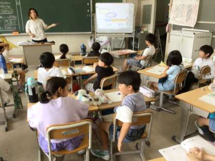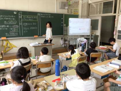 「時こくと時間」の単元の学習です。、時刻の足し算や引き算をして、問題を解いています。自分の考え方を近くの仲間に説明するペア学習を行っていました。ホワイトボードには、考え方のヒントになる数直線がプロジェクターで映されていました。