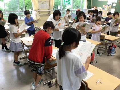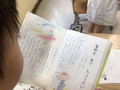 学習課題「えっちゃんがぼうしをもらったようすを考えよう」の授業の最初に、音読練習をしています。教科書には書き込みがされており、学習の足跡が分かります。