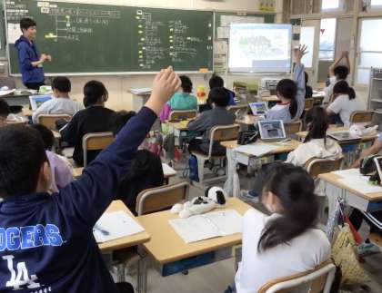 沖縄県の家や暮らしの工夫を考えています。ホワイトボードに映された図が後ろの児童にも見やすいように、学習用タブレットに図などの資料を送って、手元でよく見えるようにしています。